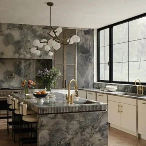 The sleek, ultra-modern aesthetic is evolving with natural textures, curved furniture, and soft neutral palettes that exude warmth. Materials like textured plaster, raw silk wall coverings, and sculptural wooden furniture are softening contemporary spaces while maintaining a sophisticated feel. One approach that I specifically like to use on walls or as a finishing approach to range hoods or floor-to-ceiling fireplace surrounds is Roman Clay. So what is it, this finishing approach is clay-based, plaster-like – that creates texture on smooth interior walls. It is smooth to the touch with a finished marble-like effect.