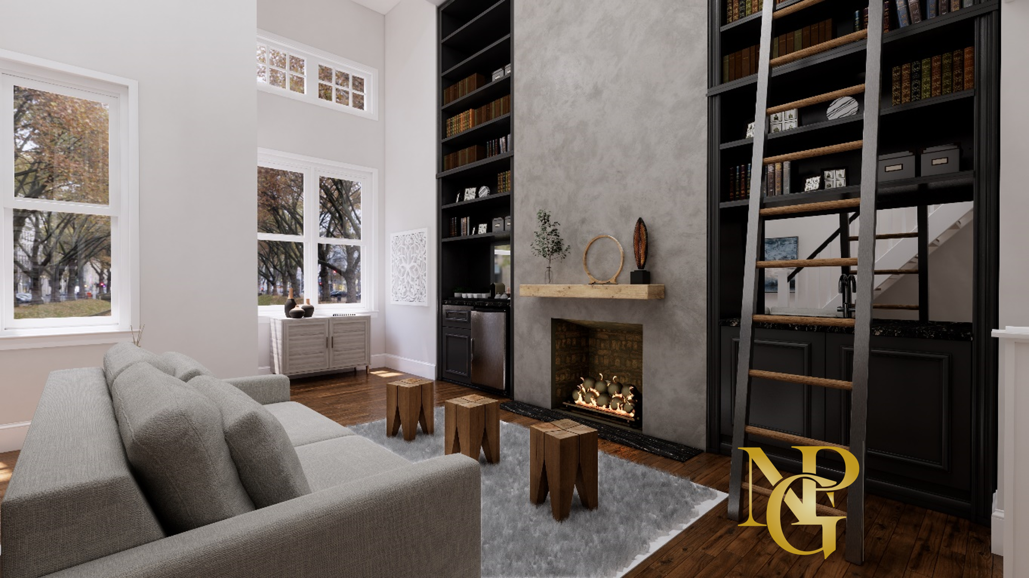 An NPG Custom-Designed Fireplace, Bookshelves and Sliding Ladder for 20ft Ceilings