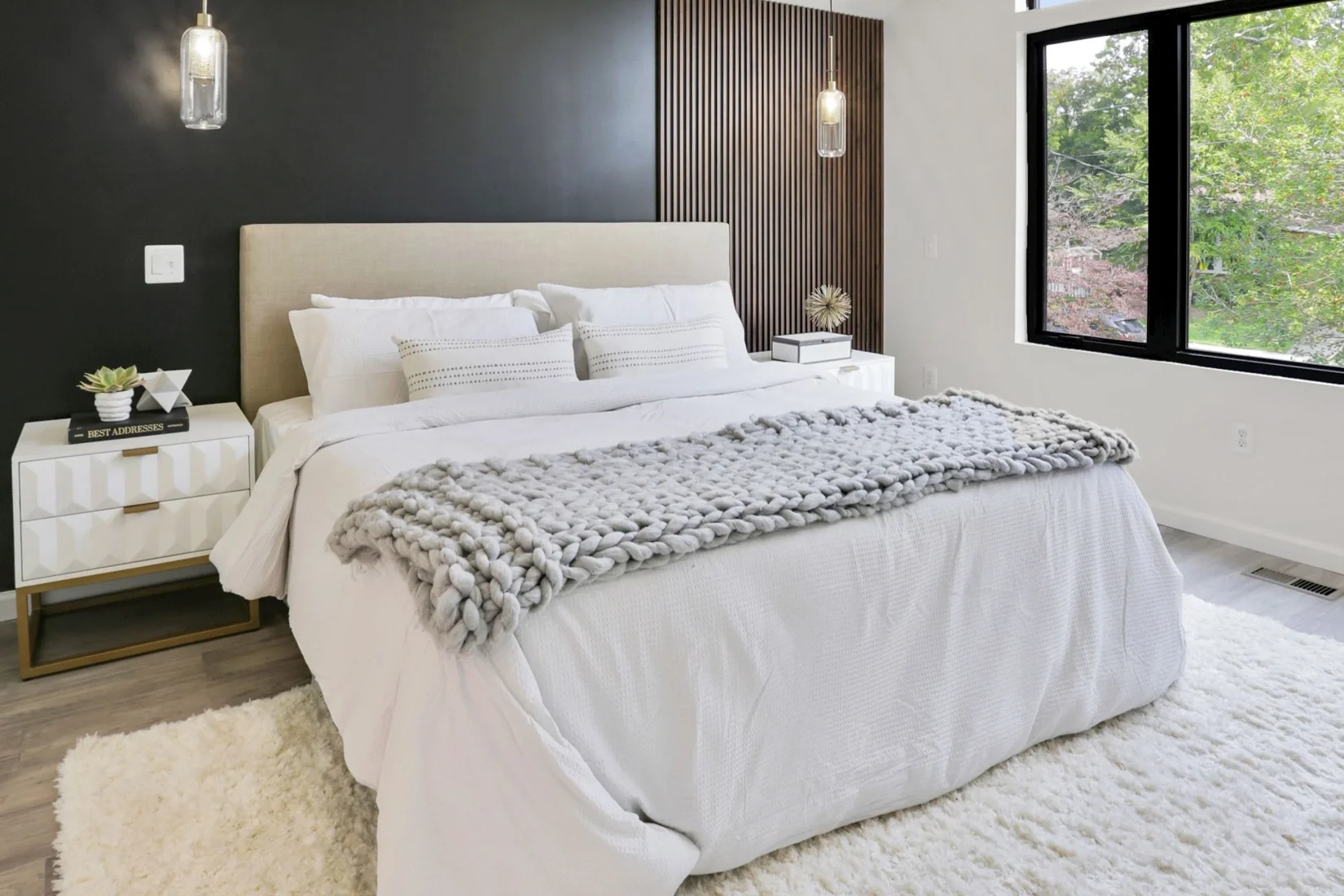 For our clients, we added rich wood elements to the Primary bedroom wall against a neutral black. The added benefit of the large, custom, pentagon-shaped black trimmed window by Pella ensured ample lighting throughout the room.
