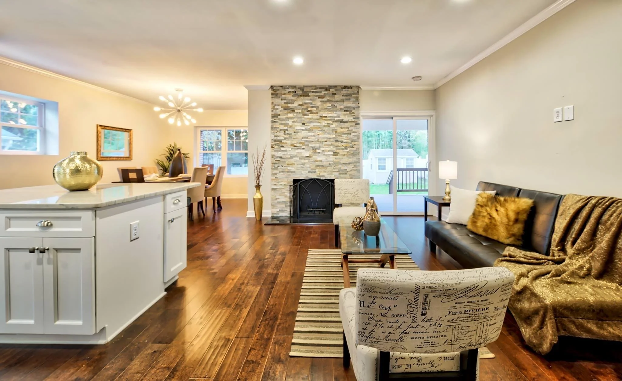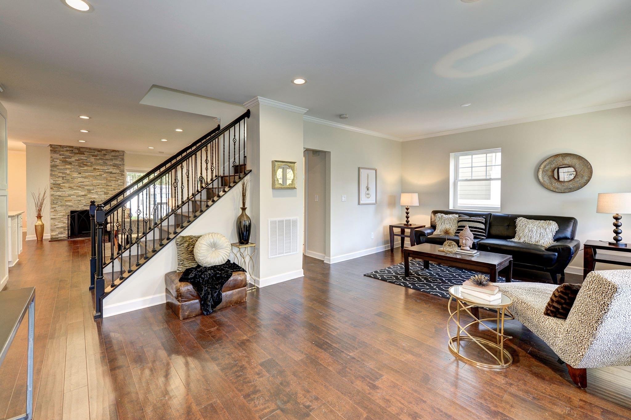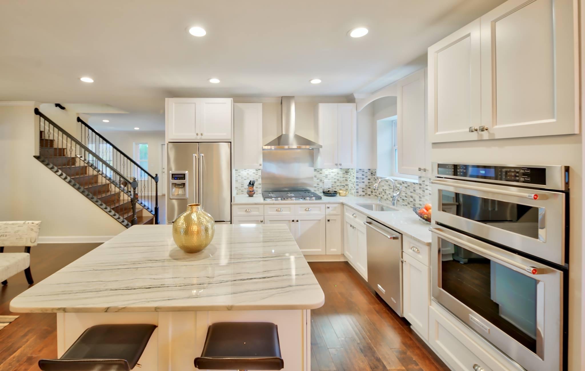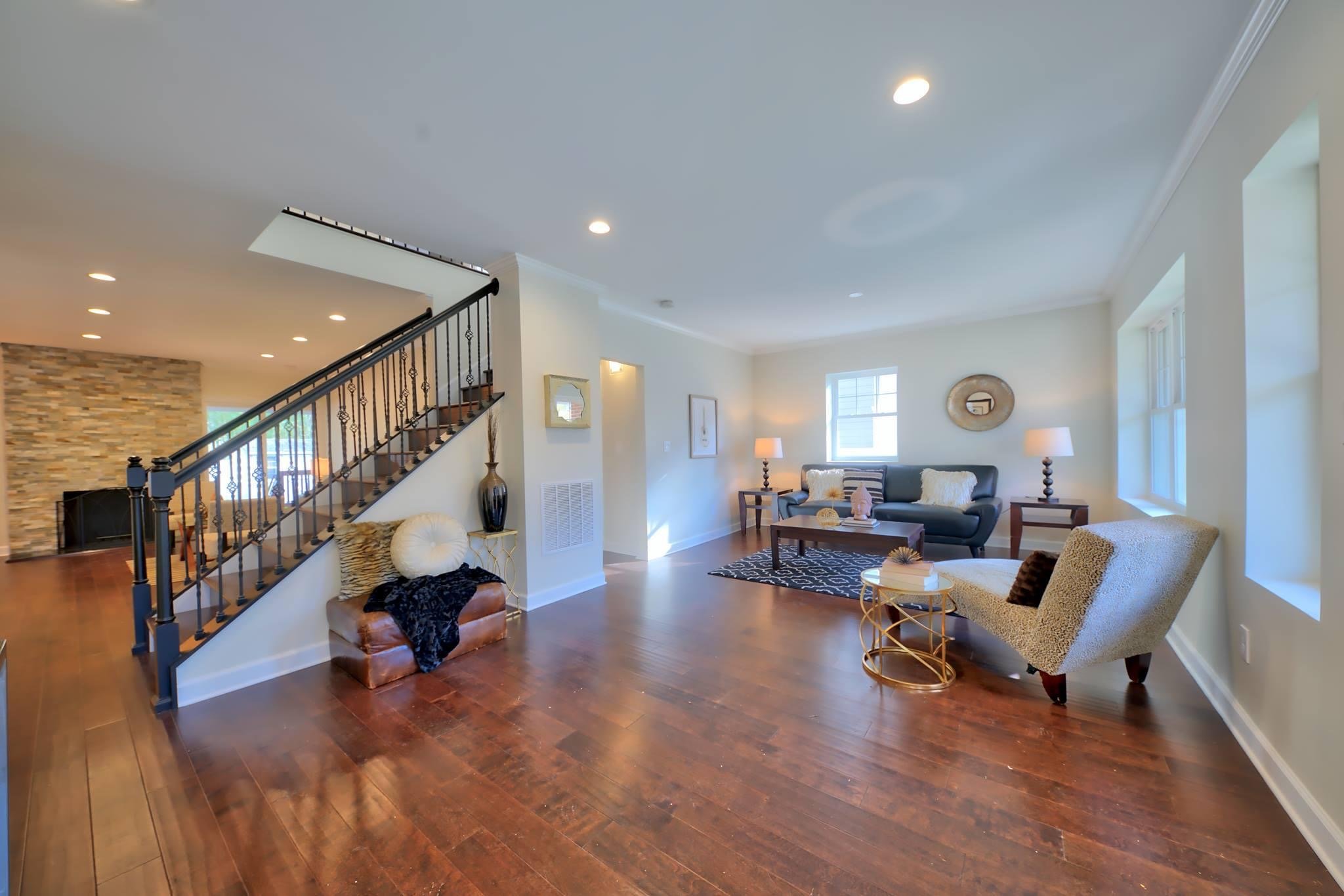 This 1950’s Ranch style home got a 2-level addition and a full home modern make over to elevate its living space for those who desire more. The functional yet open floor plan allowed for a statement-making staircase to catch the eye of every visitor while providing a full bathroom and bedroom on the main level for an au pair or an in-law suite. 5” hand scraped Burnished Acacia hardwood floors stretches the eye beyond the formal living room into the floor to ceiling slate stone gas fireplace of the family room.